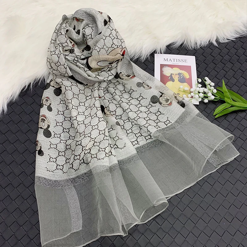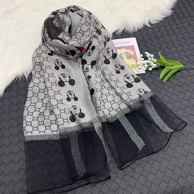 Special Disney Apparel Accessories Women Fashion high quality cartoon Mickey Mouse silk wool shawl gold frame printed silk scarf